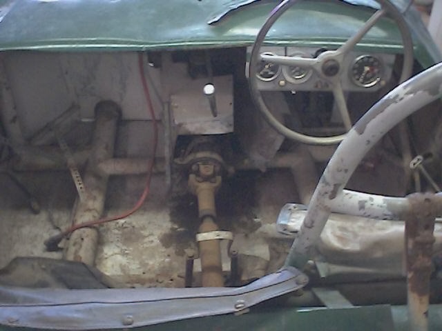 From what little we know and recall about your car, it’s a 1950 or so iron block crosley, coupled to, as memory serves, a Triumph (mayflower?) rear end, utilizing, again from memory, a Fiat transmission and Fiat brakes. According to Bill Schley, when he found the car, it was in a barn, serving as a pallet, and had hay bales and feed sacks stacked on it. That would certainly account for the distortion in the body panels. From what we have learned, the Fiat transmission was commonplace, as the Crosley transmission is pure crashbox, and the Triumph rear end was popular, due to the 4.56 or 5.1 gears availble.”