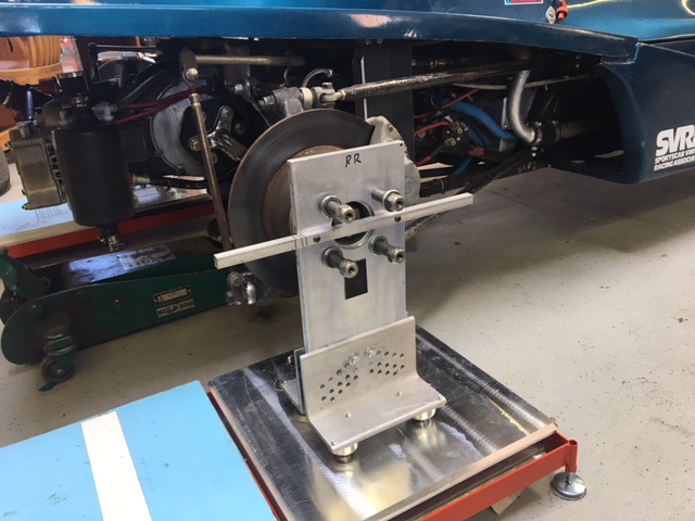 One issue I had as I began to use this setup pad was that each pad assembly would move each time the chassis was lifted, the camber change would move the pads sideways.  Also I didn’t have a good point to measure and set the ride height.  So I added a cross brace to the pads and that eliminated lateral movement and reliable place for ride height.  Not gorgeous but cheaper than a full setup pad.
